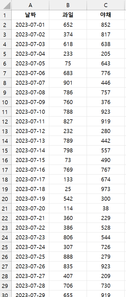 [Weeknum] 해당 날짜가 몇 주차인지 알아보기 (+매월 주별/품목별 판매량/판매비율 구하기) 문제상황 매일의 판매량을 raw data로 관리하고 있는 회사에서 일별 판매량 raw data를 활용해 매월 주차별 판매량의 합계와 총 판매량 중 품목별 판매비율을 알아보도록 하겠습니다. 아래 예시 형태의 raw data가 23.07.01부터 23.09.30까지 있다고 해보겠습니다. 관련 내용 2023.04.17 - [업무 관련/엑셀] - [Year, Month, Day] 날짜 추출(활용) 함수 2023.04.24 - [업무 관련/엑셀] - [ifs] 조건 A라면 □□를, 조건 B라면 △△를, 조건 C라면 ○○를...(if 반복) 2023.04.06 - [업무 관련/엑셀] - [eomonth] 특정 월의 마지막 날 구하기 (1달 전의 마지막 날, 12달 후의 마지막 날 등) 2023.03.24 - [업무.. 업무 관련/엑셀 2023.10.17