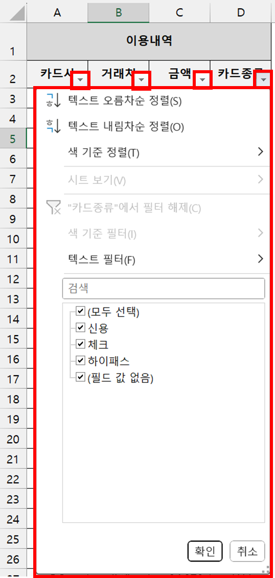 [필터 기능] 조건에 맞는 값들만 추려서 보여주기 문제상황 raw data 양이 많을 경우, 자료를 그냥 보는게 아니고 가끔 필터링을 해서 봐야할 때가 있습니다. 함수로 필터링을 하는 것과 표에서 직접 필터링을 하는 방법 두 가지가 있는데 이번에는 표에서 필터링을 적용시켜보겠습니다. 예시로는 카드 이용내역을 활용하여 하이패스 카드의 값만 필터링을 해보도록 하겠습니다. 해결 방법 단축키 : ctrl + shift + L 제가 제일 즐겨쓰는 방식입니다. 가장 편해요. 표의 헤더가 한 줄일 때 raw data 표에서 구분(헤더)가 한 줄만 있을 때에는 표 내부의 셀을 아무거나 하나 클릭한 후에 단축키 ctrl + shift + L 을 눌러주면 자동으로 헤더 부분에 필터링 버튼이 생성됩니다. 필터링을 해제할 때도 역시 단축키를 누르면 됩니다. 표의 헤더가 두 .. 업무 관련/엑셀 2023.11.13