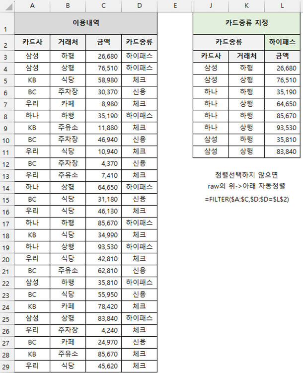 [Filter, Sort] 조건에 해당하는 값들만 추려서 보여주기 (필터기능X. 함수) 이전 글에 이어서 이전 글에서 엑셀의 필터 기능을 이용해서 표의 값을 추려내는 방법에 대해서 알아봤습니다. 2023.10.26 - [업무 관련/엑셀] - [필터 기능] 조건에 맞는 값들만 추려서 보여주기 이번에는 함수를 활용해서 raw data는 그대로 두고 조건에 해당하는 값들만 추려서 따로 보여줄 수 있는 filter 함수를 사용해보겠습니다. 예시는 똑같이 카드 이용내역입니다. 설명 =filter(배열, 포함, [if_empty]) 배열 : 추출해낼 값의 범위입니다. 조건은 E열에 있고, E열 조건을 충족할 경우 A열~D열 표를 그대로 표기하고 싶으면 배열은 A:D 의 형태가 되어야합니다. 반드시 여러 열을 가져올 필요는 없습니다. E열 조건을 충족할 경우 B열 하나만 가져올 수도 있습니다. 이 경우.. 업무 관련/엑셀 2023.11.06